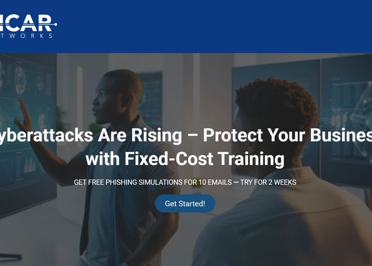 The website offers fixed-cost training, free phishing simulations, and employee security awareness programs to turn staff into a powerful first line of defense against cybercrime