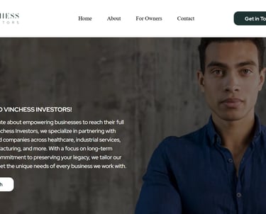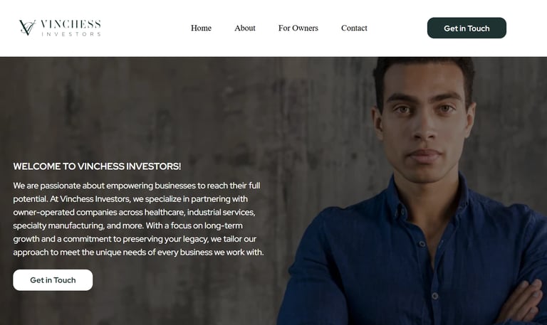 Vinchess Investors is a specialized investment platform designed by Joe Web Solutions to connect owner-operated businesses with growth capital and acquisition opportunities. Focused on long-term success, the website highlights tailored investment solutions, leadership transitions, and liquidity options for businesses in healthcare, industrial services, specialty manufacturing, and distribution.